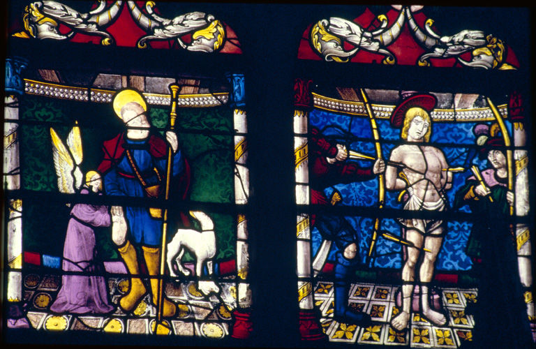 inscription concernant le commanditaire : reconstituée, au bas des lancettes ; devise : au tympan (RECOURS A DIEU) ; armoiries non identifiées : dans les têtes de lancettes (du donateur ?)