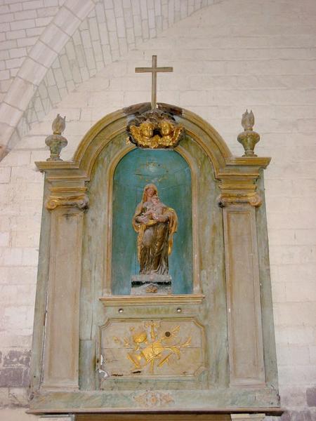 Décoré de pots à feu, de pilastres à chapiteaux à voltes, d'un trophée avec orfèvrerie liturgique et de 2 putti dans les nuées.