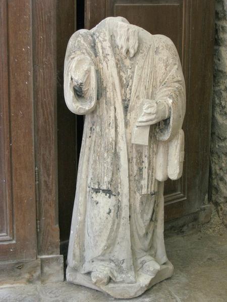 Il manque la tête, la main droite et des doigts à la main gauche ; attache en fer rouillé au dos.