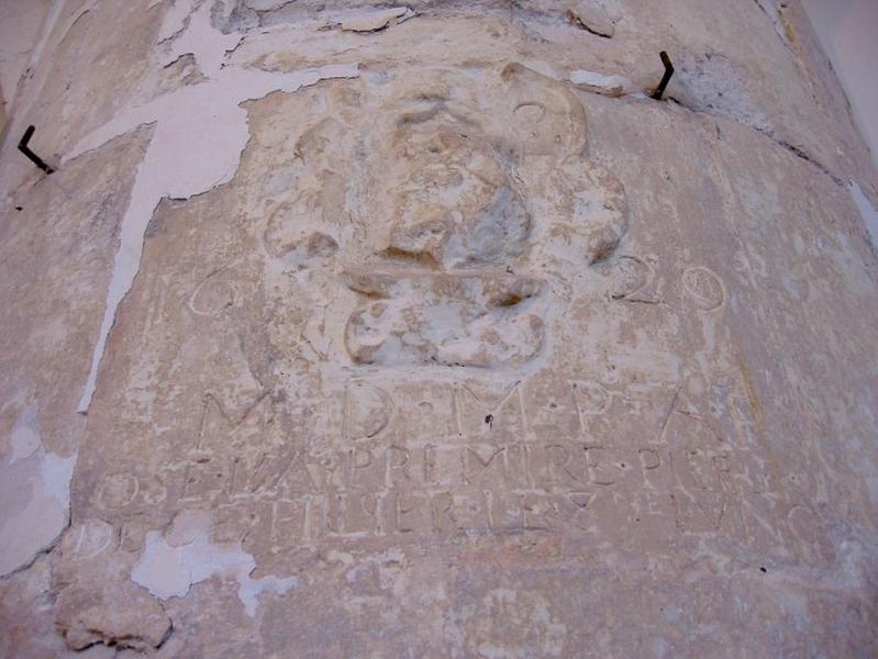 Armoiries bûchées. Transcription : 1629/ M.D.M.P. A P/OSE LA PREMIERE PIERRE / DE CE PILIER LE 8ME JUNG.