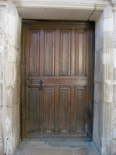 Serrure inscrite dans une fleur stylisée (ou cercle polylobé). Heurtoir en forme de noeud délié.