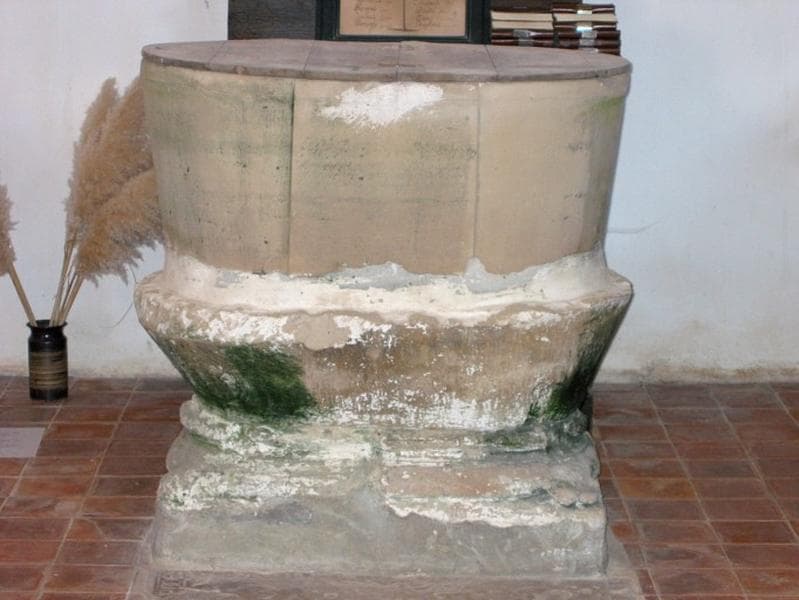 Deux cuves superposées : une cuve moderne (19e s.), taillée dans une pierre grossière et poreuse, est posée sur une cuve ancienne (fin 12e s.) en calcaire. Le couvercle de la cuve moderne est en bois. La cuve ancienne, assez basse, comporte une base à griffes. Il s'agit peut être d'une ancienne cuve à immersion.