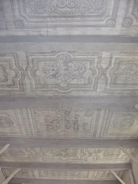 Plafond peint, organisé en 5 registres délimités par les poutres. Occupe toute la surface de la nef.