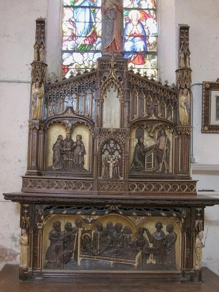 Reliefs figurés sur le devant d'autel, et sur les faces latérales ; plus 2 reliefs sur le retable. Avec 2 statuettes aux angles.