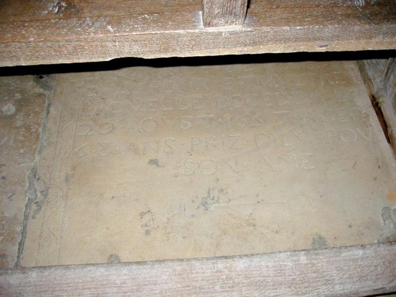 Transcription : CY GIST JEHANNE DOYEN / EN SON VIVANT FEMME / DE Mre PIERRE JULLIOT JUGE / EN GARDE DE MAROLLES / CHAUFFOUR ET AUTRES LIEUX LAQUELLE DECEDDA LE / LE 20 AOUST 1667 AGEE DE / 68 ANS PRIEZ DIEU POUR / SON AME.