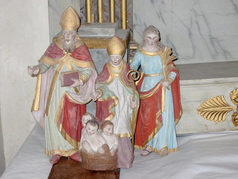 h = 38 ; la = 17 (Dimensions de l'évêque. Nicolas : h = 32) ; la = 16 ; sainte Martyre : h = 34 ; la = 15.