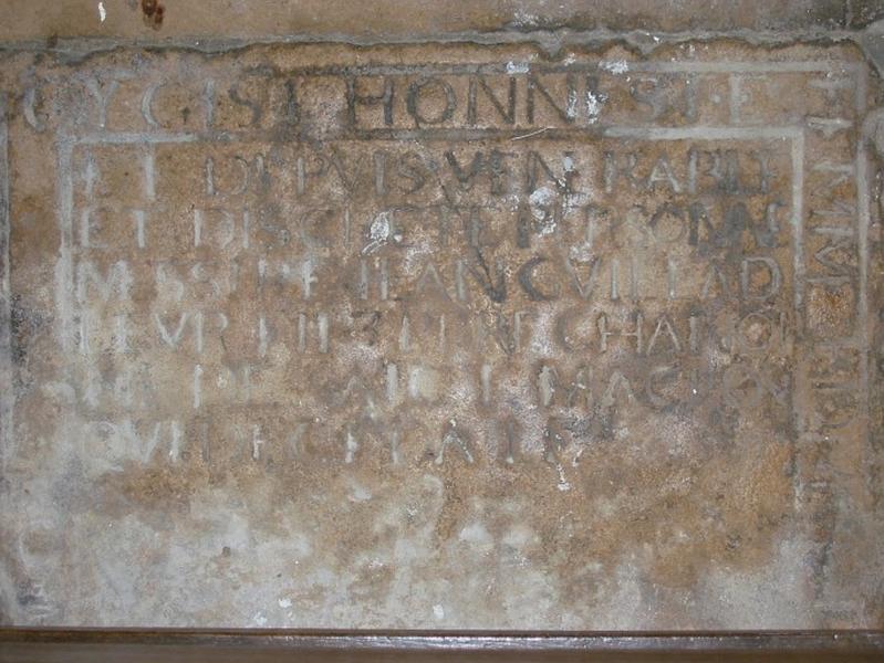 Transcription de la bordure : CY GIST HONNESTE / FEMME EDMONDE (?) VIVANT FEMME DE / DEFUNCT SIMON GUILLA/RD QUI DECEDA LE 30 [...] 1703 (?). Dans le champ : ET DEPUIS VENERABLE / ET DISCRETE PERSONNE / MESSIRE JEAN GUILLAD / LEUR FILS PERE CHANOINE / DE SAINT MACLOU / QUI DECEDA LE. La date du décès de Simon semble ne jamais avoir été gravée.