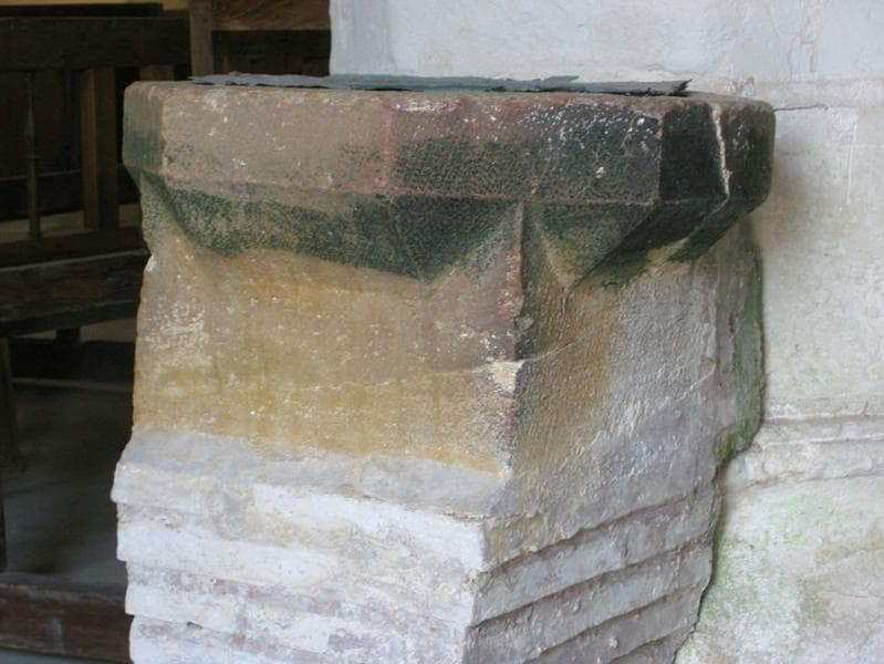 Bénitier en calcaire posé sur un pied ; cuve en étain.£De forme octogonale, et cuve circulaire assez grossièrement taillée.£Moulures imbriquées.