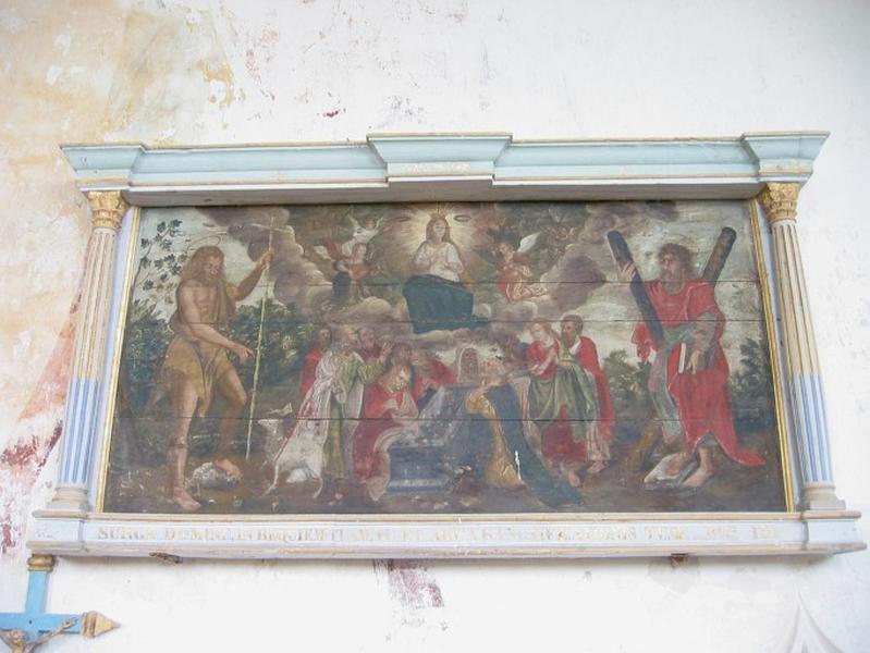 Panneau peint : Mort de la Vierge, saint André, saint Jean-Baptiste, cadre