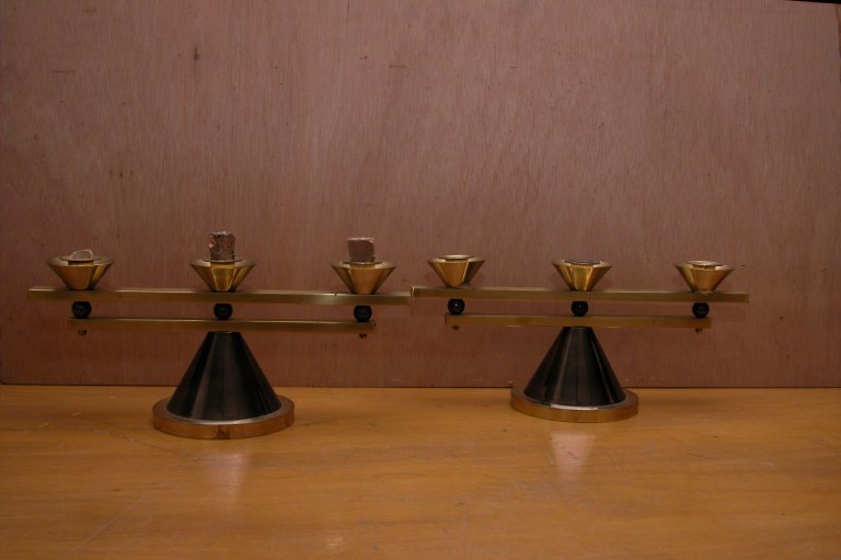 Ces deux chandeliers reposent sur un pied de plan circulaire. La partie supérieure du pied est conique, la surface du pied est polie au tour et niellée sur la partie conique. Sur le pied est fixée une première barre rectangulaire plus longue qui porte les luminaires proprement dit, au nombre de trois, doublés de coupelles coniques. Ces chandeliers ne comportent pas de décor.