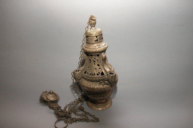 L'oeuvre est très encrassée. Il manque le dispositif en métal accueillant les braises et l'encens. Une chaînette est cassée. Le pied s'affaisse.