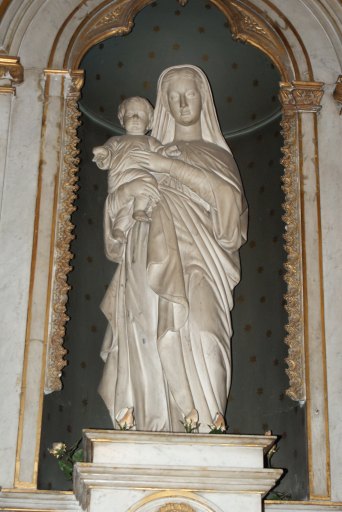Cette statue est en marbre blanc veiné de gris. Elle est située au centre du retable consacré à la Vierge du Rosaire. L'oeuvre est fixée sur un socle de bois.