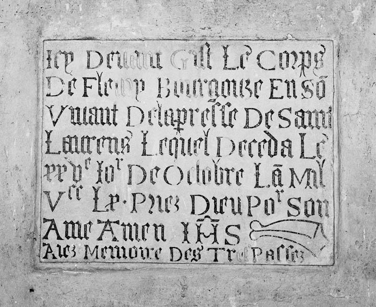 épitaphe : ICY DEVANT GIST LE CORPS/DE FLEURY BOURGOISE EN SON/VIVANT DE LA PARESSE DE SAINCT/ LAURENS LEQUEL DECEDA LE/XXVE JOUR DE OCTOBRE L'AN MIL/VCC LX. PRIEZ DIEU POUR SON/ AME AMEN/IHSAIEZ MEMOIRE DES TRESPASSEZ