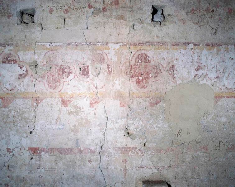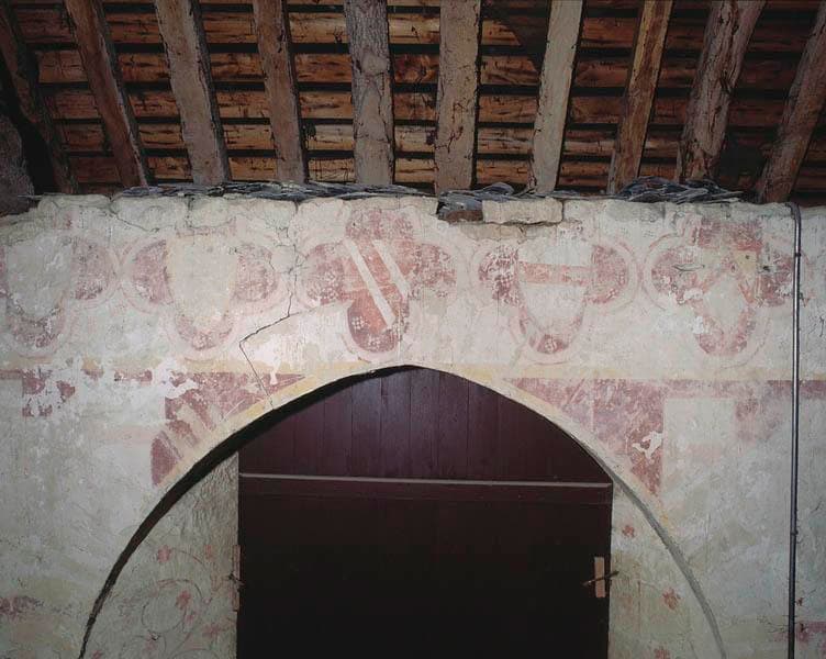 Peinture couvrant toute la surface des murs de l'aile ouest y compris les embrasures des baies, les manteaux des cheminées et les poutres séparant les étages