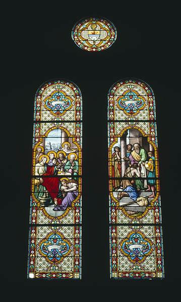 ensemble de 16 verrières figurées : Léon XIII, Monseigneur Hugonin, Monseigneur Amette, Apparition du Sacré-Coeur à sainte Marguerite-Marie Alacocque, Apparition du Coeur Sacré de Marie à saint Jean-Eudes, saint Jean Soreth, Pierre Berthelot, Apothéose de saint Louis de Gonzague, Assomption, Apparition de la Vierge à saint Dominique de Guzman, Mariage de la Vierge, Fuite en Egypte, Saint Stanislas Kostka recevant la communion de la main d'un ange, Transverbération du coeur de sainte Thérèse d'Avila, Vie du Christ
