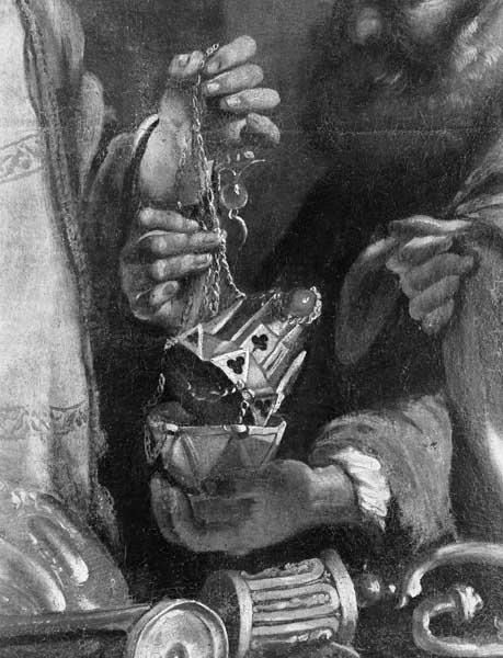 scène historique (saint Laurent diacre, don, vieux, vieille, orfèvrerie, aiguière, calice, crosse, encensoir)
