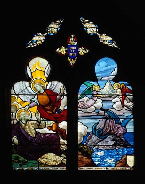 POP | Plateforme ouverte du patrimoineensemble de 10 verrières (décoratives, à personnages) : Dernière messe des soldats en partance, Ange de la victoire célébré par les soldats et leurs familles, Retour des soldats, Poilu au pied de la Croix, sainte Jeanne d'Arc entendant les voix, Vision de saint Aubert d'Avranches