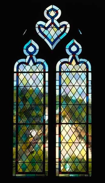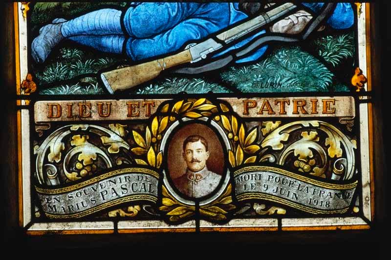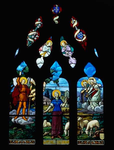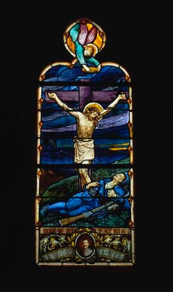 ensemble de 10 verrières (décoratives, à personnages) : Dernière messe des soldats en partance, Ange de la victoire célébré par les soldats et leurs familles, Retour des soldats, Poilu au pied de la Croix, sainte Jeanne d'Arc entendant les voix, Vision de saint Aubert d'Avranches
