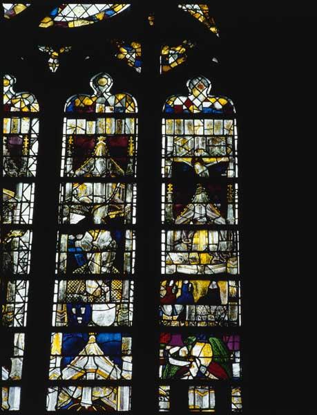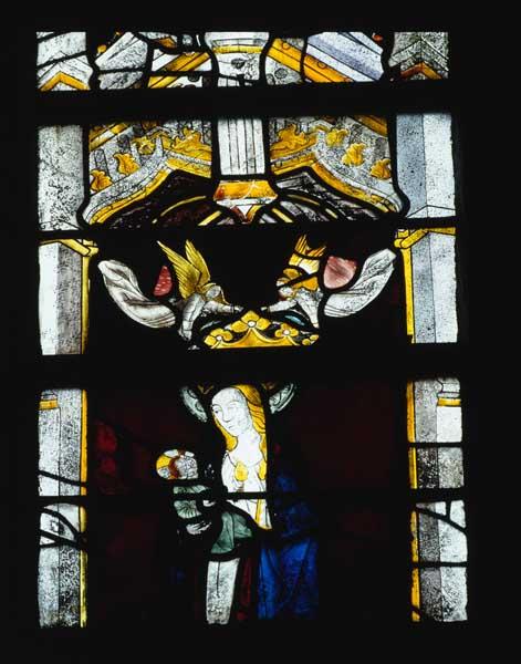 verrière figurée : Vierge à l'Enfant, Crucifixion, Abbé en donateur
