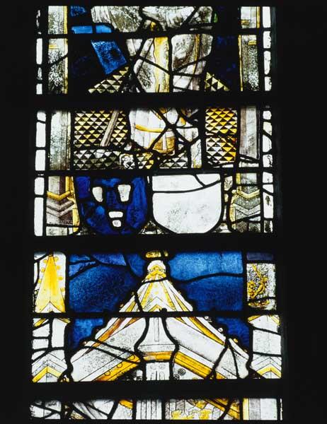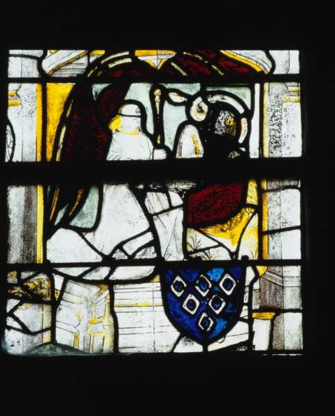 Inscriptions nominatives sur des galons surmontant les tentures damassées de fond. Quelques phylactères. Inscription incomplète dans un cartouche : « Mre Jhan a doné ceste vitre...pour luy. Amen ».