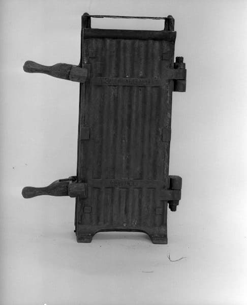 Moule à 12 matrices composé de 3 plaques assemblées par 4 gonds : une plaque interne et deux plaques externes ; les deux plaques externes sont creusées de 6 demi-formes à cierge, la plaque centrale est double face ; les deux plaques externes comportent chacune deux pieds pour assurer une position verticale, la plaque intermédiaire est munie d'une poignée en acier, vissée ; fermeture par 2 manetons pivotant, en étau sur la tranche