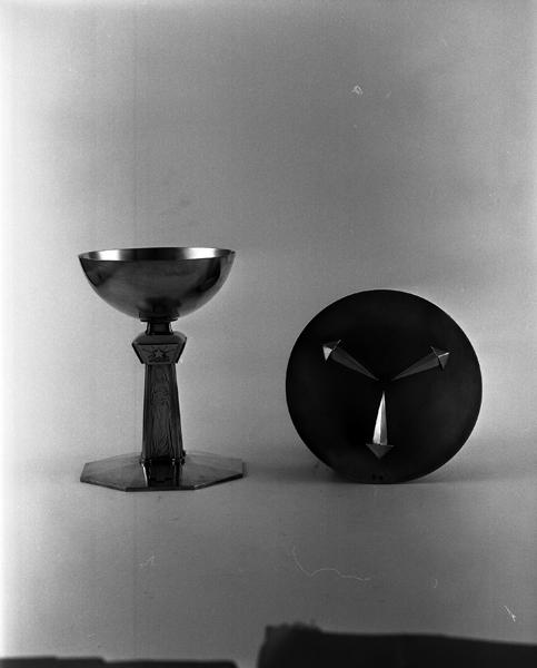 Le calice : ornementation en deux registres sur la tige et le noeud. Vierge à l'enfant et étoile rayonnante au dessus des eaux. Figure de pélerin de profil et pélican. Sainte Thérèse de Lisieux et la couronne d'épines. Prêtre tenant une hostie et un calice, symbole de l'Eucharistie, et un coeur surmonté d'une croix avec l'inscription : JESUS CARITAS. Sur le pied : la croix. Sur la patène trois clous.
