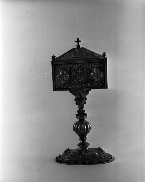 L'authentique manuscrite datée de 1832 semble contemporaine du reliquaire même si le pied adopte une ornementation dans l'esprit du 17e siècle.