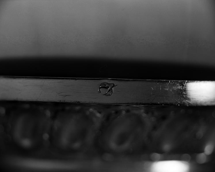 Les poinçons sont insculpés sur et sous le pied. Charge : lettre O sous une couronne fermée. Décharge : une poire de coing. Contremarque : un A couronné. Poinçon de maître : un grain entre les lettres P et A couronnées.