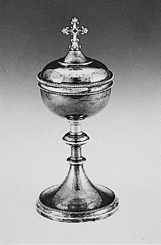 Croix fondue soudée au couvercle.£Pied et tige en laiton ; coupe et couvercle (?) en argent