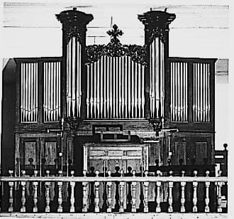 Buffet comprenant un corps central et deux ailes rapportées ; la partie centrale présente une plate-face de vingt tuyaux, flanquée de deux tourelles à cinq tuyaux chacune ; ailes rectangulaires en léger fuyant, à deux plates-faces contiguës de cinq tuyaux chacune ; cinq pédales de combinaisons ; transmissions de notes à pneumatiques tubulaires ; transmissions de jeux mécaniques ; tirasse permanente mécanique ; clavier à cinquante six notes.£Tuyaux en métal ; touches plaquées d'ivoire, les feintes en ébène
