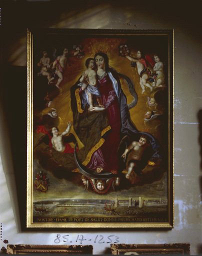 inscription en bas de la toile : NOSTRE DAME DE PORT DE SALUT. DONNE PAR RICHARD BUTLER 1664 ; armoiries identifiées du donateur : de sinople au chevron d'or accompagné de trois coupes couvertes du même
