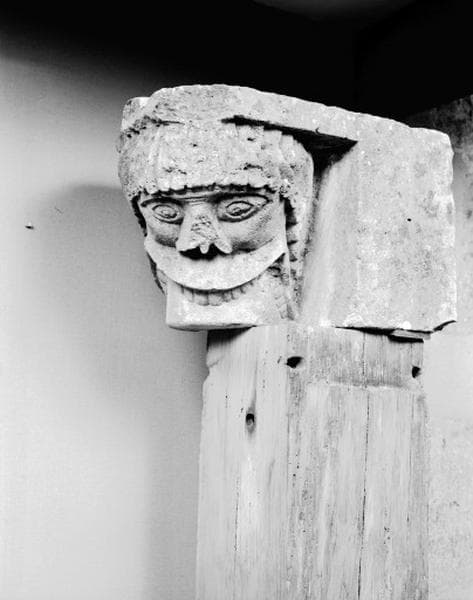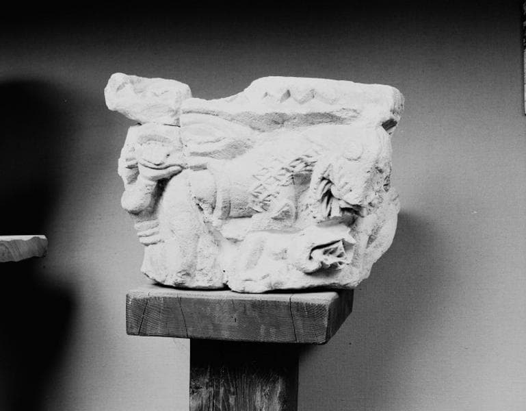 Masque chevelu gueule ouverte sur le départ d'une colonne ; main tenant la queue d'un lion passant gueule ouverte sur des feuillages.