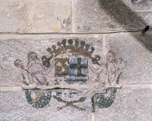 Blason couronné et encadré de deux figures féminines à queue de poisson tenant un miroir au bout d'une longue hampe (représentation de la fée Mélusine) : 1er quartier : armoiries des Fradet : d'or à trois fer de lance de sable ; 2e quartier : armoiries des Saint-Gelais : d'azur à la croix alaisée d'argent ; 3e quartier : armoiries des Lusignan : burelé d'argent et d'azur de dix pièces ; 4e quartier : armoiries des Plessis-Châtillon : d'azur à deux fasces d'argent accompagnées de six besans de même, 3, 2 et 1 ; deuxième blason : écusson écartelé, soutenu par 2 lions debout et surmonté d'une couronne comtale.