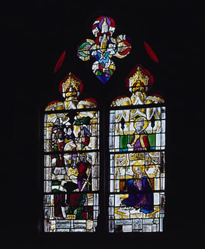 POP | Plateforme ouverte du patrimoineverrière figurée : Néron et sa suite ?, saint évêque, Vierge (baie 2)