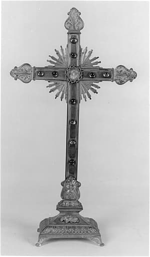 Pied et croix en bronze doré ; verre protégeant la relique ; pierres en verre coloré montées à bâtes ; montant de la croix riveté au pied