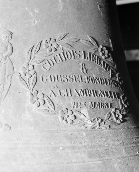 transcription de la marque du fondeur : COCHOIS ; LIEBAUX/&/GOUSSEL FONDEURS/A CHAMPIGNEULE/HTE MARNE ; transcription de l'inscription tournante du vase supérieur : FONDUE EN 1852 MR JEAN BTE PETITJEAN MAIRE DE LANTHES ; transcription de l'inscription en panneau de la faussure : BENITE SOUS L'INVOCATION DE STE ARMANDE/PARRAIN MR LE COMTE LOUIS CLES DE VOGUE/MARRAINE MME MARIE ANTTE ARMANDE DE MOYRIA
