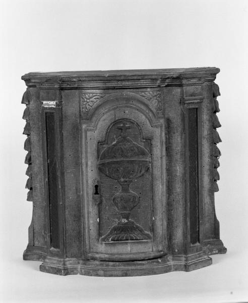 Tabernacle à façade chantournée.£Bois peint et argenté sur assiette ; pilastres et fond de la porte brun rouge ; décor de la porte sculpté ; chutes de feuilles, moulure et corniche rapportées ; autres décors gravés dans le stuc ; dos du tabernacle en bois blanc