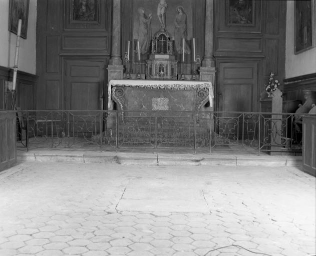 Grille de communion rectiligne ; portillon central à 2 battants ; portillon gauche à un battant ; 5 panneaux dormants ; 7 pilastres.£Fer carré et fer plat ; assemblages rivés