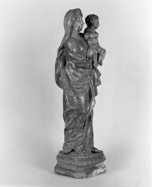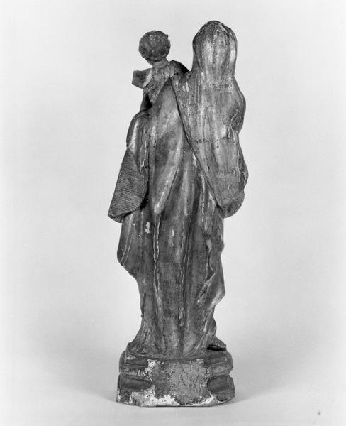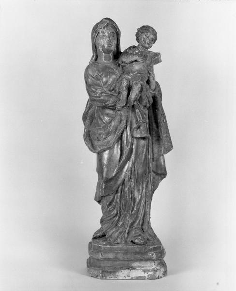 Vierge debout sur un piédestal mouluré.£Vêtements et piédestal argentés à la feuille sur assiette ; bras gauche de l'Enfant assemblé par tourillon et mortaise ; décor du manteau gravé dans l'assiette ; traces de gouge visibles par écaillage de l'assiette