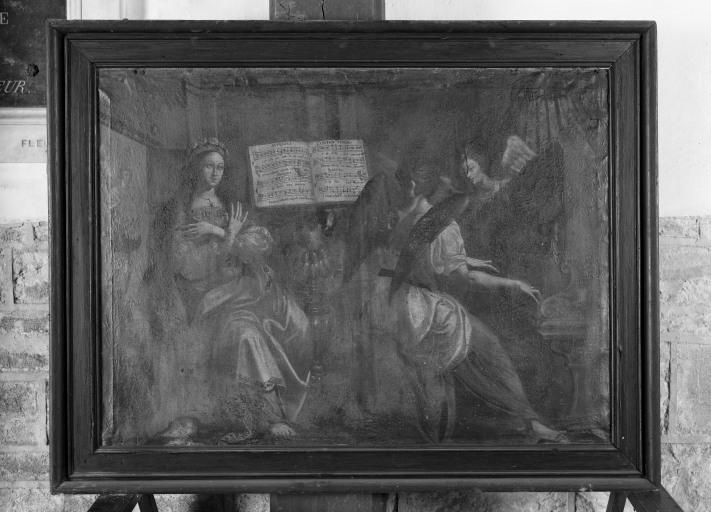Description : sainte Cécile, couronnée de roses, les mains croisées sur la poitrine, est assise en compagnie de 2 anges, dont l'un joue du positif en suivant une partition posée sur un lutrin à l'arrière-plan à gauche, dans l'embrasure de la porte, apparaît son époux Valérien.