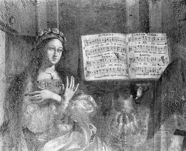 scène (sainte Cécile, assis, ange : musicien, orgue, lutrin, partition, saint Valérien)
