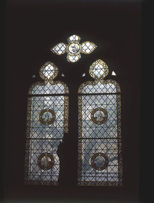 verre transparent (coloré) : grisaille sur verre, jaune d'argent ; plomb (réseau)