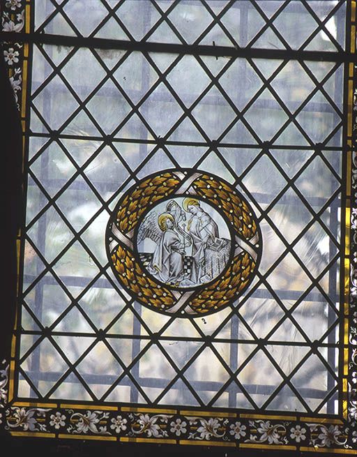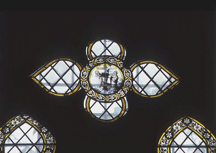 5 rondels de l'extrême fin du 15e siècle et du début du 16e siècle ont été remontés dans une vitrerie losangée des 19e et 20e siècles