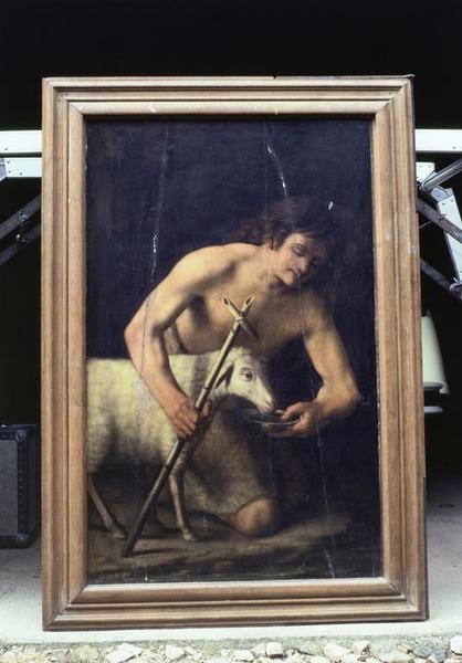 Corps du Christ, visages, robe de saint Jean repeints ; parquetage du revers du panneau central désassemblé ; 4 brisures obliques ; fentes verticales et écaillage des bords des panneaux latéraux