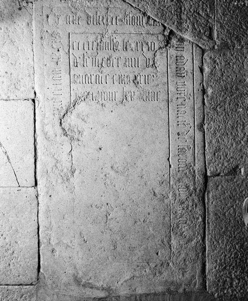 épitaphe en lettres gothiques sur la bordure et sur le champ de la dalle : (CY) GIST DISCRETE PSONE (...) / (...) NATIF DE SATOSSE (...) / (...) /ET TRESPASSA LE XXIO IOR/DE SEPTEBRE MIL V/QUARATE CINQ PRIEZ/DIEU POUR SON AME