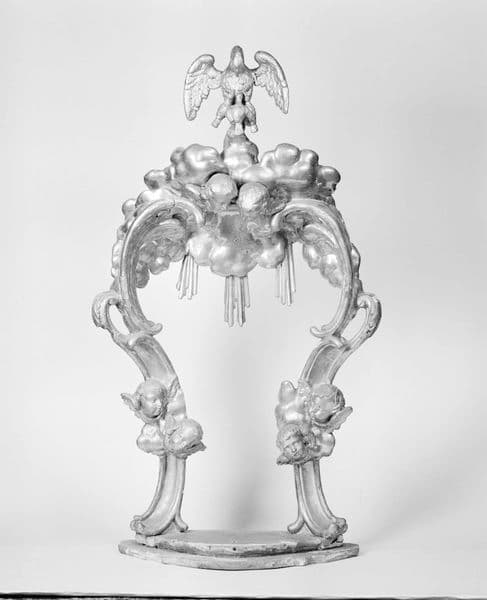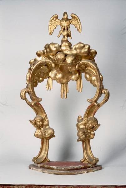 bois : taillé (décor dans la masse, décor rapporté), doré, peint (rouge)