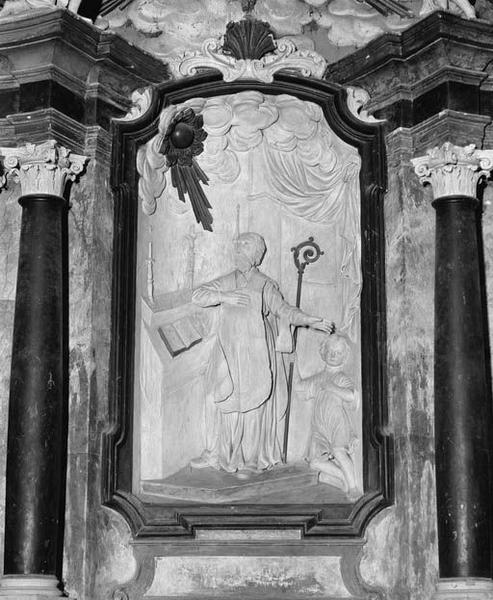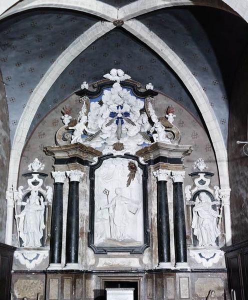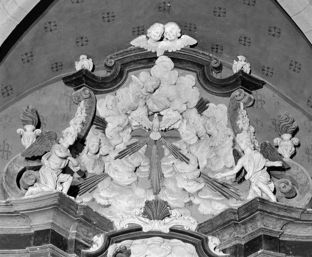 Anges adorateurs sur le couronnement du retable, saints sur les ailes.