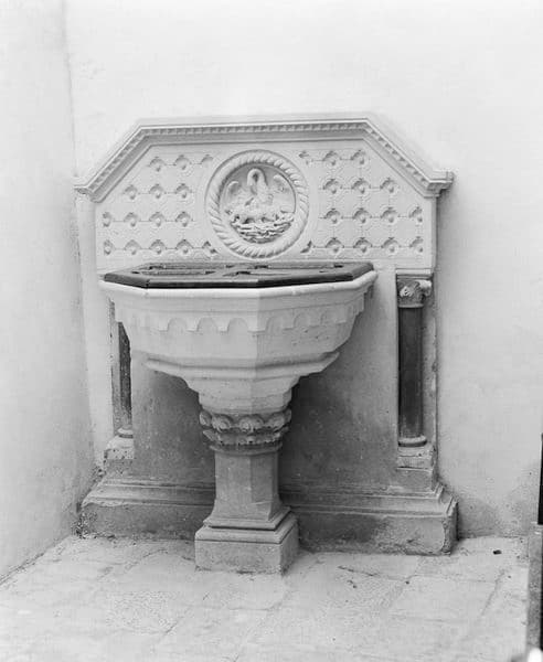 fonts dans la nef ; relief déposé dans la sacristie