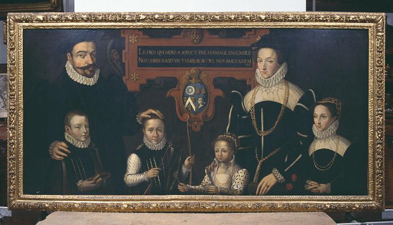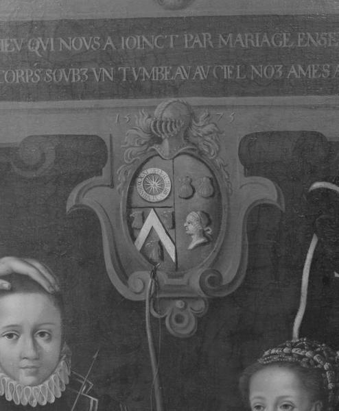 inscription et date (peintes dans un cartouche) : LE DIEV QVI NOVS A IOINCT PAR MARIAGE ENSEMBLE/NOZ CORPS SOVBS VN TOMBEAV AV CIEL NOZ AMES ASSEMBLE/1575 ; inscription (récente, à la craie sur le châssis) : MUSEE DE DIJON ; inscription (manuscrite à l'encre sur étiquette sur le châssis) : NO 2063/PT HCE BEAUNE/RENT. REST. ; armoiries : mi parti, au 1 : écartelé, en A : d'azur au cadran d'or, les rayons et aiguilles du même, les heures de sable, en B : d'azur au chevron d'argent accompagné de trois têtes de lion d'or, au 2 : d'azur au profil d'homme d'argent accompagné en chef de deux coquilles d'or ; casque : à lambrequins