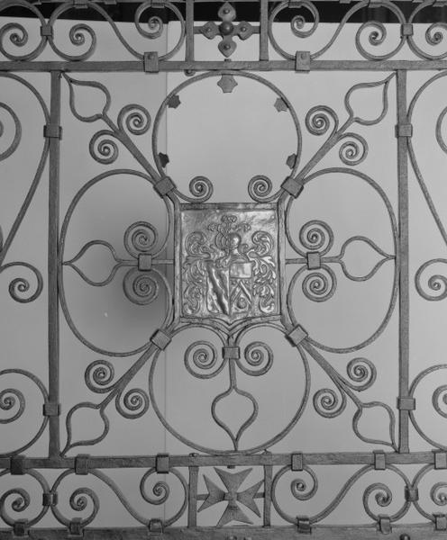 armoiries ; symbole christique (croix pattée) ; ornementation (volute, quatre feuilles, tête d'animal)